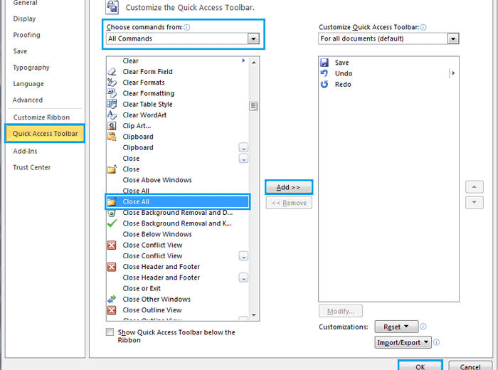 To close all open documents or windows in Word, you can use several methods: Close all documents or windows by clicking Taskbar: Put your cursor on the Taskbar and right-click. Click “Close all windows.” Close all documents or windows by using Close All command: Add the “Close All” command to the Quick Access Toolbar: In … Continue reading How to close all open documents or windows in Word